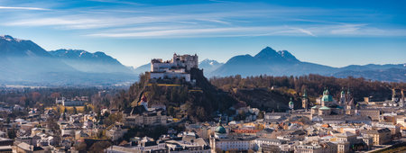 Panorama of Salzburg, Austria, looking over the historic Old Town, with the Salzach River, the hills Kapuzinerberg and Gaisberg, and the castle (Festung Hohensalzburg) at right