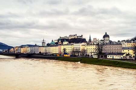 Beautiful view on Salzburg castle with river and historical residential buildings in the foreground during cold cloudy Winter time.