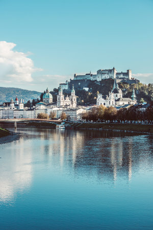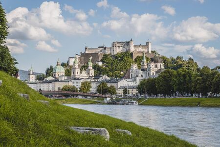 Beautiful view of Salzburg skyline with Festung Hohensalzburg and Salzach river in summer, Salzburg, Salzburger Land, Austria