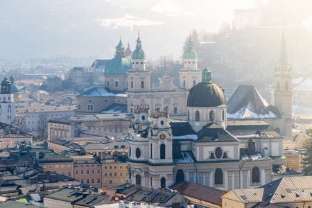Salzburg historic district at Christmas time, snowy rooftops with sunshine, Austria