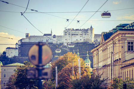 Salzburg historic district at autumn time, colorful leaves and colors with sunshine, Austria