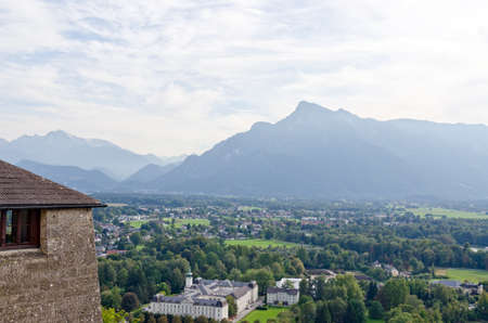 Background landscape view of the walls of Hohensalzburg Fortress and the surrounding hills and mountains in Salzburg, Austria