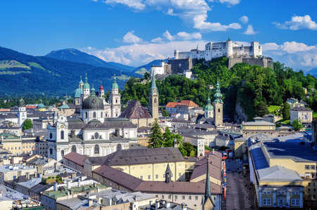 Salzburg city, Austria, view of the Old Town and Festung Hohensalzburg castle on a beautiful sunny day. Salzburg is a birthplace of classical composer Mozart.