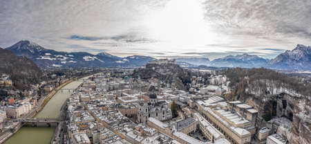 Aerial drone shot view of Salzburg southern outskirts with snow mountain and Salzach river in winter morning sun time