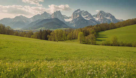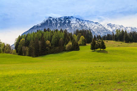 Beautiful sunset panorama view in Inntal on alps in Tirol, Austria. With green fields near Kufstein, Kaiser, Kaisergebirge, border with Bavaria (Bayern) Germany.