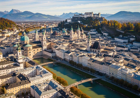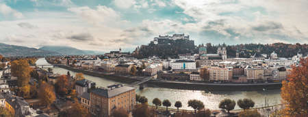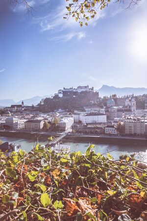 Panorama of Salzburg historic district at autumn time, colorful leaves and colors with sunshine, Austria