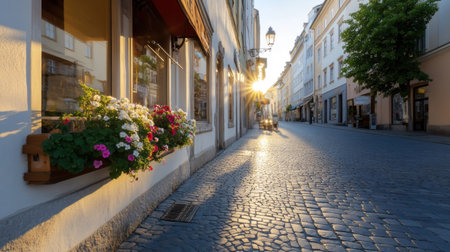 A picturesque street in Europe, bathed in sunlight, with cobblestone and flowers.
