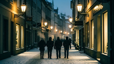Charming european Christmas town street decorated with holiday lights and falling snow at twilight. concept of festive atmosphere, winter wonderland, holiday decor.