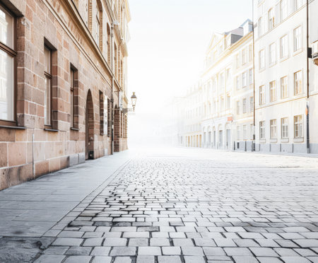 A tranquil cobblestone street is bathed in soft morning light, highlighting the historic buildings on either side.