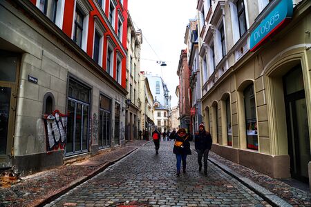 RIGA , LATVIA - April 01, 2018: Street and houses on it in old part of Riga city in cloudy spring day