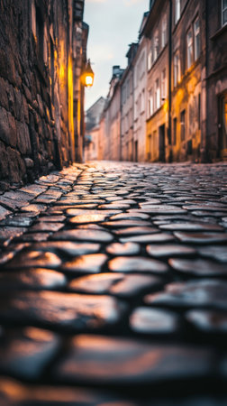 Wet cobblestone street reflecting warm sunset light between ancient buildings in a historic european town, creating a charming and nostalgic atmosphere