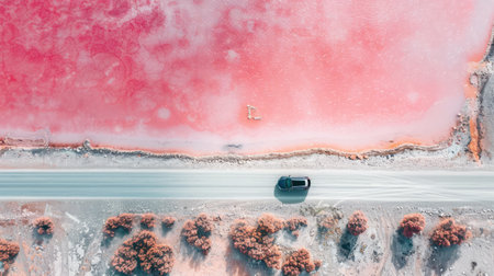 Generative AI, Pink salt lake landscape with the road and car driving, aerial view