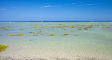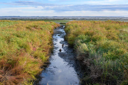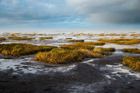 Wadden sea on the island Romo in Denmark, intertidal zone, wetland with plants, low tide at north sea