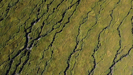Abstract textures and veins cutting thru the wetlands of a tidal river system in Tasmanias Swan river area, Australia