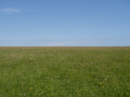 Open wide field of grass in front of a blue sky with clouds in Northern Germany.