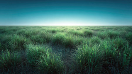 A close-up shot features lush green grass dominating the frame, with individual blades textured and detailed. Above, a deep blue sky provides a contrasting backdrop. The scene evokes a sense of natural beauty. Suitable for a range of commercial applications, including editorial and marketing material.