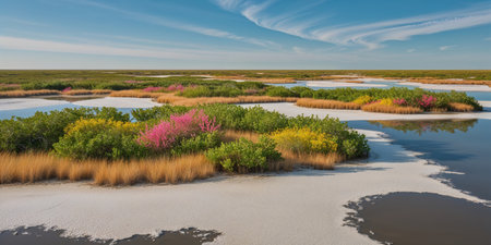 AI Generated. Aerial View of Coastal Wetlands with Colorful Vegetation and Dry Salt Lakes