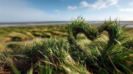A beautiful heart-shaped grass formation creates a stunning focal point in a lush green landscape, under a bright blue sky with soft clouds.