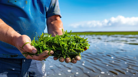 A pair of hands cradles fresh seaweed, showcasing a vibrant green color. The coastal scene captures the beauty of nature, with water reflecting the serene blue sky.