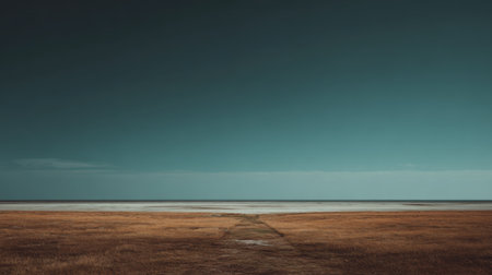An expansive view of a seascape at dusk, highlighting the contrast between the golden grassland and the moody blue sky, promoting feelings of peace and solitude.