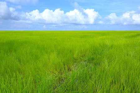 Grass field against the blue sky and clouds on a spring day. Rural landscape.