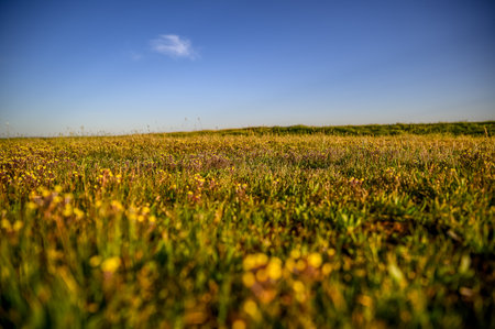 A detailed view of a vibrant green meadow abundant with small yellow and white wildflowers, showcasing natural...
