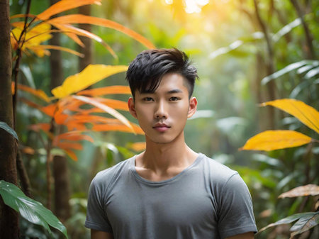 Handsome young Asian man in white shirt standing in tropical garden.
