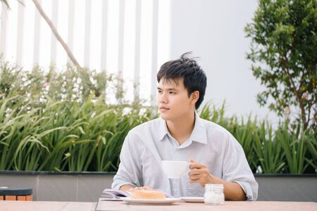 Young Asian man relaxing in the streets outdoors