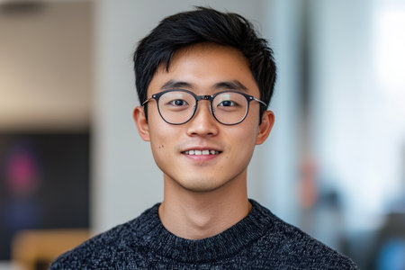 Portrait of a handsome young Asian man wearing glasses and looking away