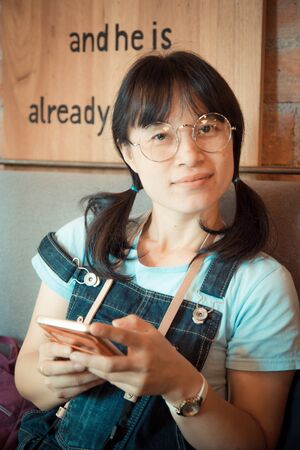 Hipster asian woman use cellphone while sitting in vintage cafe, Woman hand holding a smart phone