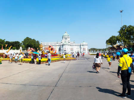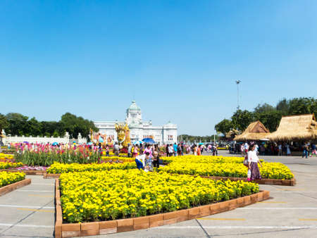 Royal winter festival,Un Ai Rak Khlai Khwam Nao,at Royal Plaza,Dusit Palace and Sanam Suea Pa,Bangkok,Thailand on March3,2018:Anantasamakhom Throne Hall and colorful flowers.