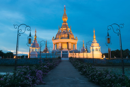 Beautiful modern pagoda reflection with water during sunset twilight time at Khon Kaen, Thailand.