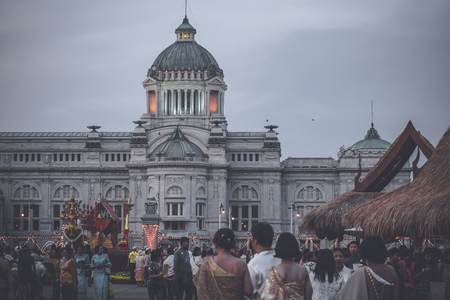 Bangkok, Thailand - March 2, 2018: People in national clothes walk during the fair near Ananta Samakhom Palace Throne Hall in Thai Royal Dusit Palace at day time in Bangkok,Thailand.
