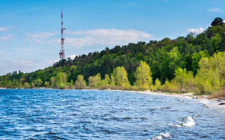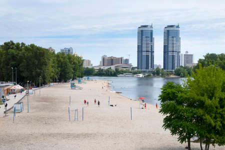 Kiev, Ukraine, May 30, 2019: City beach, on the banks of the Dnieper River, on a summer sunny day. Beach season.