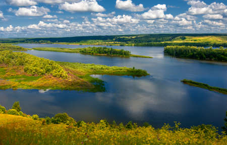 Summer landscape, river a large natural stream of water flowing in a channel to the sea, a lake, or another such stream.