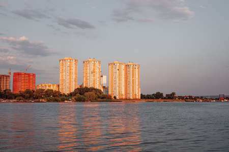 Urban landscape at dawn. Photo of the city and several high-rise residential buildings against the background of gray clouds, a deserted beach and a river