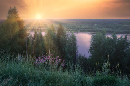Summer landscape of the river. Sunrise sunset. every day on planet Earth can begin serene with the rising of the sun, when the sky gently brightens over the golden eastern horizon.