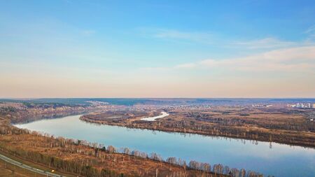 Aerial top view panorama city Perm and central embankment of Kama river Russia, sunset drone photo