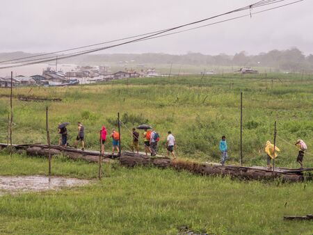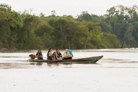 AMAZON, BRAZIL - DECEMBER 31: Unknown people on a boat in the rain on Rio Negro in the Amazon River basin, Brazil, South America on December 31st, 2017