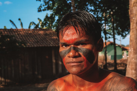 Warrior indian man from an Amazon tribe in Brazil with tribal art painted on his face. 2009.
