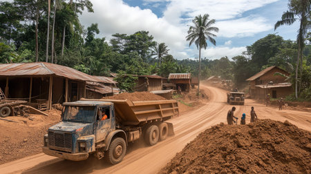Dusty construction site with heavy machinery, where a haul truck transports soil for mining civil works and infrastructure projects.
