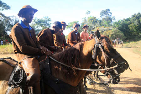 Conde, Bahia, Brazil - January 9, 2022: Cowboys wearing typical leather costumes participate in a competition to capture the x in the woods in a rural area in the city of Conde.