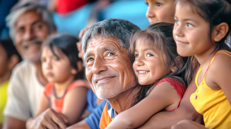 Gathered at a thrilling soccer match, a South American family, spanning generations, joyfully cheers as their beloved team plays, radiating happiness and excitement.