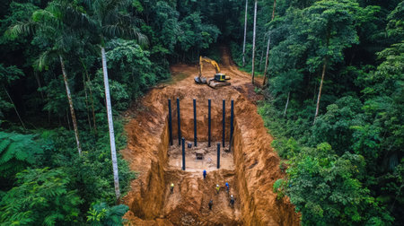 Aerial photograph of a remote dirt road cutting through a dense tropical forest. AI generated.