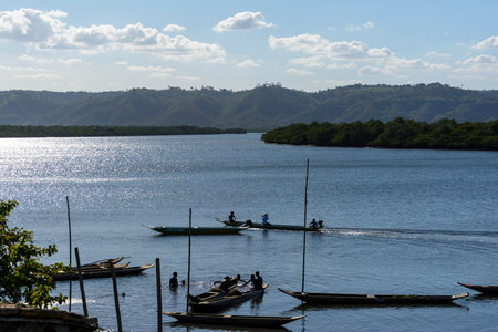 MAROANTSETRA, MADAGASCAR OCTOBER: 19.2016: Native malagasy man fishing on river, using technique pulling net from boat. Daily life of peoples in Madagascar countryside. October 19. 2016, Madagascar