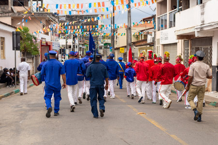 Saubara, Bahia, Brazil - August 06, 2022: Members of a Marujada walk through the streets of the city of Saubara, in Bahia, during the Chegancas meeting.