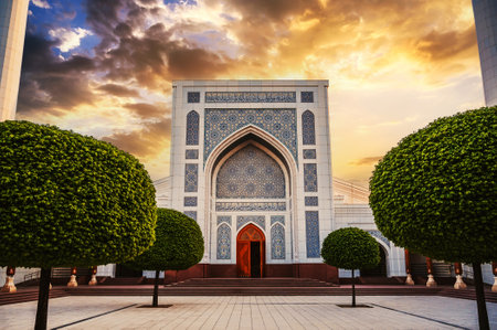 modern Islamic white Masjid Minor Mosque in Tashkent in Uzbekistan on background of sunset sky in spring