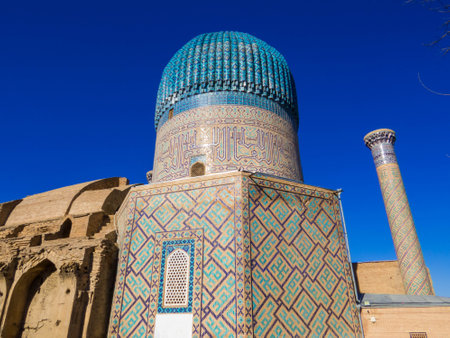 Awesome view of the Gur-e-Amir (Guri Amir) in Samarkand, Uzbekistan. Exterior of mausoleum of the Turco-Mongol conqueror Timur (Tamerlane). The tomb is a popular tourist attraction of Central Asia.