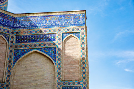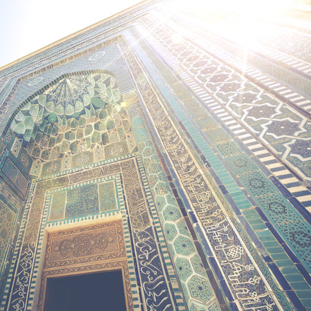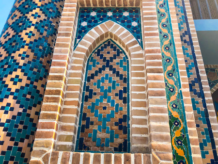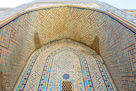 Detail of the facade of the historical holy cemetery of Shahi Zinda in Samarkand, Uzbekistan.