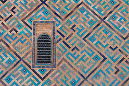 Fragment of a mosaic wall of a Central Asian mosque with a window. close up